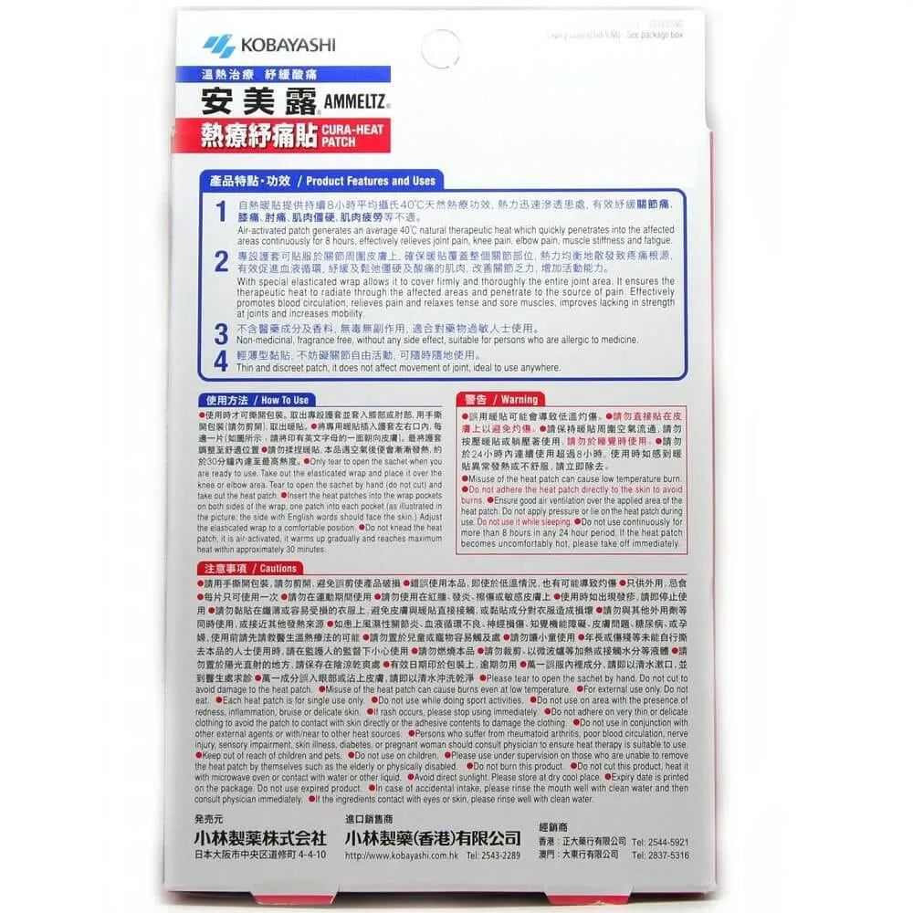 Directions: For external use only. Do not eat.•Do not use on children. Please use under supervision on those who are unable to remove the heat patch by themselves such as the elderly or physically disabled.•Only tear to open the sachet when you are ready to use it. Tear to open the sachet by hand (do not cut) and take out the heat patch.•Remove the thin film, adhere the heat patch to clothing or underwear over the painful area of your back.•Do not knead this product, It is air-activated, it warms up gradually and reaches maximum heat within approximately 30 minutes.