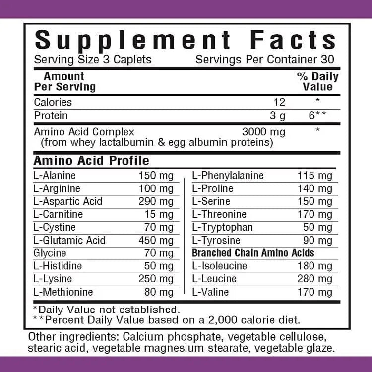 Bluebonnet's Amino Acids 1000 mg Caplets provide free-form and dipeptide-bonded, pharmaceutical-grade amino acids from whey lactalbumin and egg white albumin proteins that are rich in muscle-building branched chain amino acids (BCAAs). Since these anabolic amino acids are compressed into easy-to-swallow caplets for maximum assimilation and absorption, they are more bioavailable to help increase nitrogen retention for enhanced muscle growth, strength, and repair.