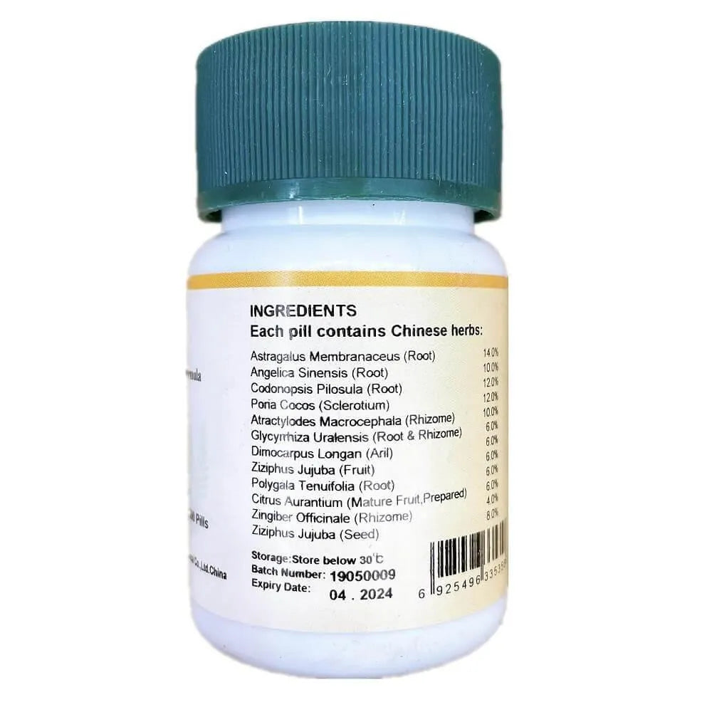 Astragalus Membranaceus, Angelica Sinensis, Codonopsis Pilosula, Poria Cocos, Atractylodes Macrocephala, Glycyrrhiza Uralensis, Dimocarpus Longan, Ziziphus Jujuba, Polygala Tenuifolia, Zingiber Officinale.
