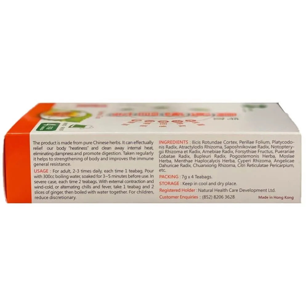 This product is made from pure Chinese herbs. It can effectually relieve our body's "heatiness" and clean away internal heat, eliminating dampness and temporarily relieving the common cold.
