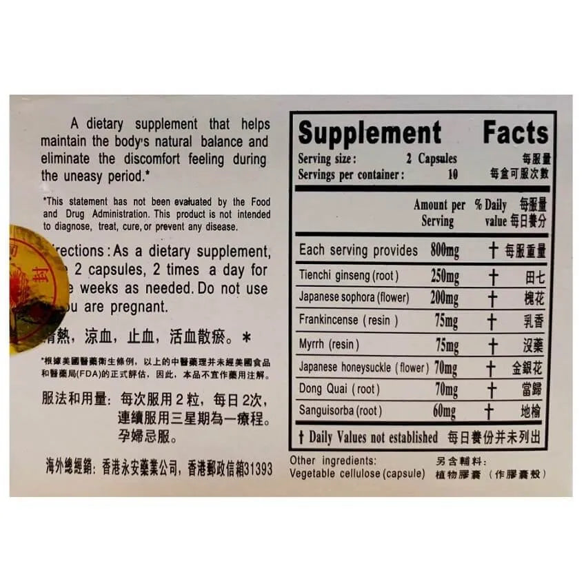 Extra Strength 400mg per capsule. Ingredients including tienchi ginseng, Japanese sophora, Japanese honeysuckle, and dong quai.