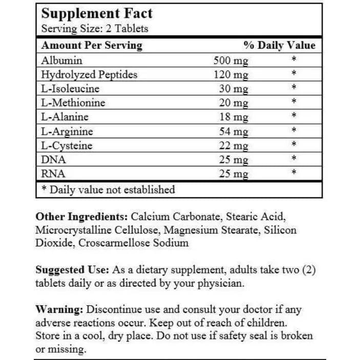 The formula is further enhanced with hydrolyzed peptides and select amino acids, including L-Isoleucine, L-Methionine, and L-Arginine, which contribute to protein synthesis, muscle maintenance, and cellular regeneration. Additionally, the inclusion of DNA and RNA supports healthy cellular renewal, helping to maintain optimal function as the body ages or recovers from stress.