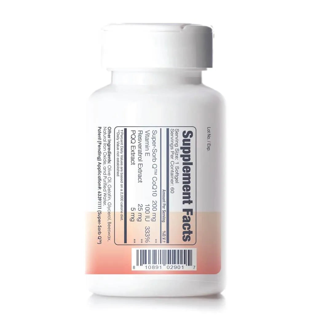 - Super-Sorb Q, 200mg CoQ10 with Ubiquinol. Also contains Vitamin E, Resveratrol and PQQ.