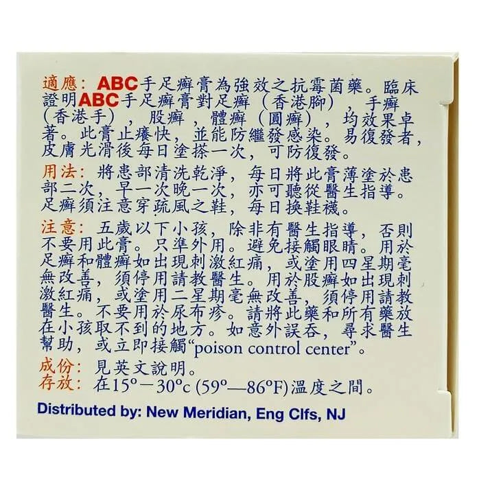 适用: ABC手足癣膏为强效之抗霉菌药。临床证明ABC手足癣膏对足癣(香港脚), 手癣(香港手), 股癣,体癣(圆癣),均效果显著。此膏止痒快,并能防继发感染。易复发者,皮肤光滑后每日涂擦一次,可防复发。